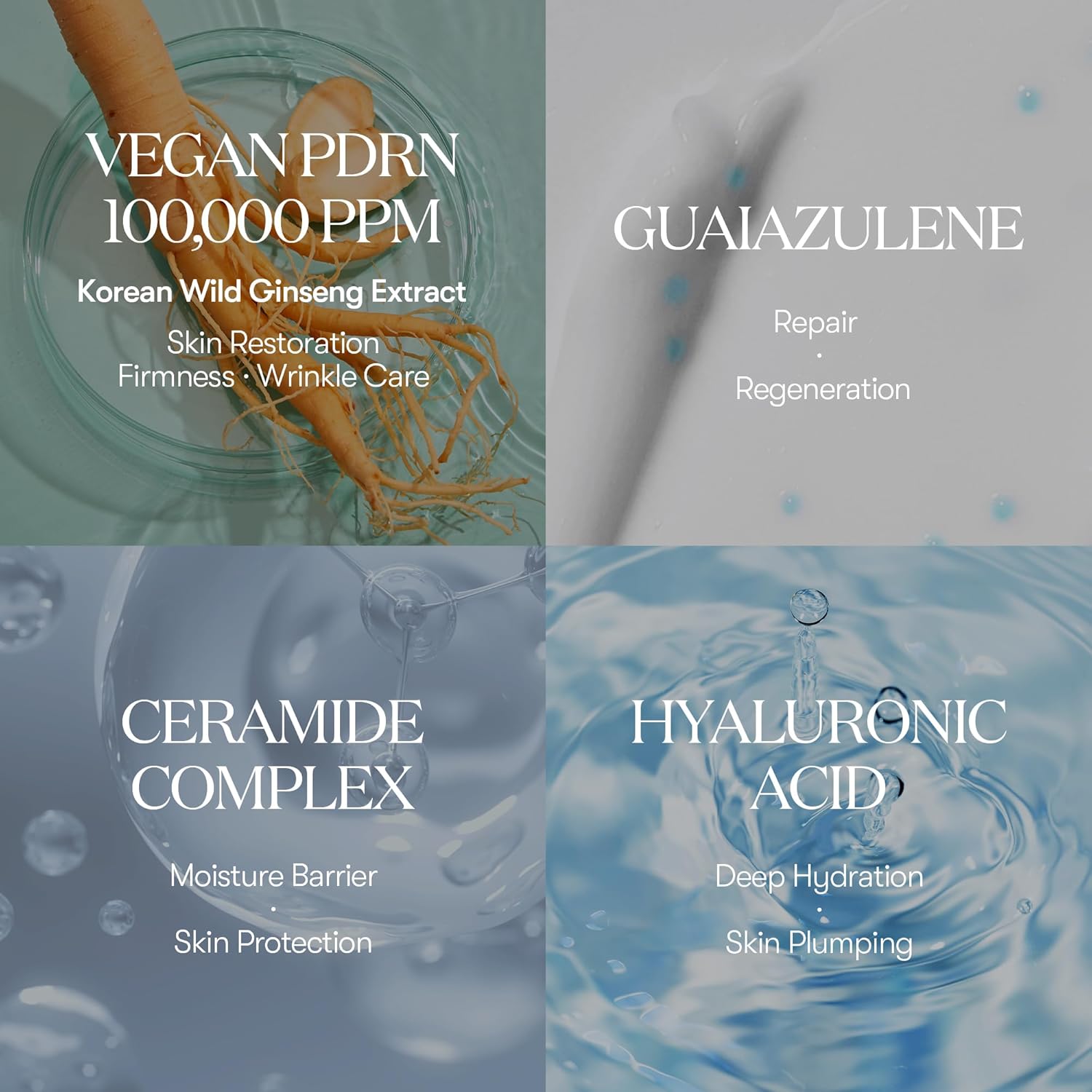 Water, Glycerin, Butylene Glycol, Hyaluronic Acid, Methyl Hydrogenated Rosinate, C12-15 Alkyl Benzoate, Polyglycerin-3, Caprylic/Capric Triglyceride, 1,2-Hexanediol, Niacinamide, Caprylic/Capric/Myristic/Stearic Triglyceride, C14-22 Alcohols, Bis-Diglyceryl Polyacyladipate-2, Vinyl Dimethicone, Macadamia Ternifolia Seed Oil, Hydrogenated Vegetable Oil, Panax Ginseng Root Extract, Solanum Melongena (Eggplant) Fruit Extract, Eclipta Prostrata Extract, Ocimum Sanctum Leaf Extract, Corallina Officinalis Extract, Simmondsia Chinensis (Jojoba) Seed Oil, Curcuma Longa (Turmeric) Root Extract, Amber Powder, Cetearyl Alcohol, Palmitic Acid, Hydrolyzed Sodium Hyaluronate, Hydroxypropyltrimonium Hyaluronate, Hydrolyzed Hyaluronic Acid, Potassium Hyaluronate, Hyaluronic Acid, Moringa Oleifera Seed Oil, Ceramide NP, Melia Azadirachta Leaf Extract, Melia Azadirachta Flower Extract, Glucose, Coccinia Indica Fruit Extract, Sodium Hyaluronate, Pentylene Glycol, Sodium DNA (0.5ppm), Sodium Hyaluronate Crosspolymer, Ceramide NS, Sodium Acetylated Hyaluronate, Cholesterol, Phytosphingosine, Ceramide AS, Ceramide AP, Sodium Guaiazulene Sulfonate, Ceramide EOP, Panthenol, Betaine, Glyceryl Stearate, Polyacrylate-13, Stearic Acid, C12-20 Alkyl Glucoside, Cetearyl Glucoside, Hydrogenated Polyisobutene, Glyceryl Acrylate/Acrylic Acid Copolymer, Polyglyceryl-10 Laurate, Ethylhexyl Palmitate, Sorbitan Isostearate, Cyamopsis Tetragonoloba (Guar) Gum, Agar, Hydrogenated Lecithin, Carbomer, Tromethamine, Xanthan Gum, Allantoin, Adenosine, Disodium EDTA, Ethylhexylglycerin