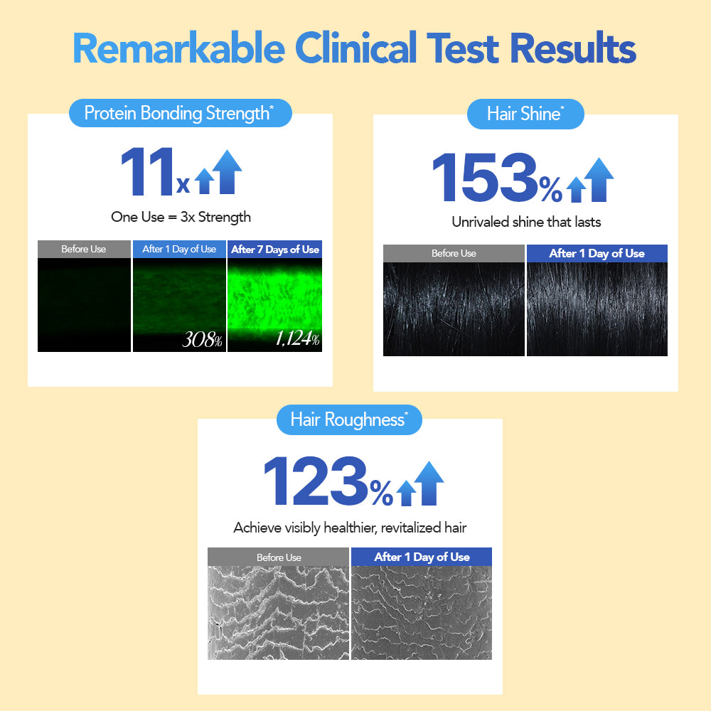 Klinisk vist å umiddelbart forbedre hårets glans og glatthet med én bruk; forbedrer proteinbinding dramatisk på 7 dager.