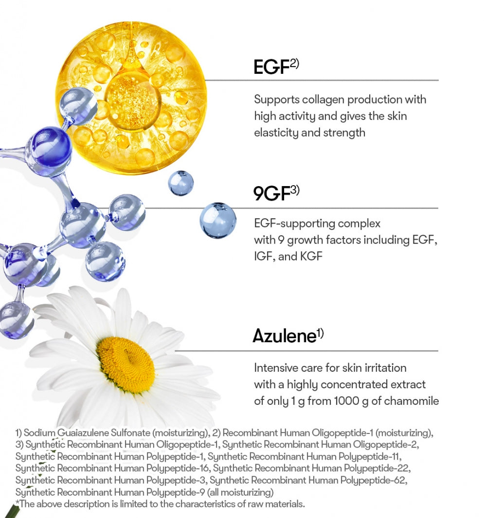 Denne kremen er formulert med et kraftfullt kompleks av Epidermal Growth Factor (EGF) og 9 ulike vekstfaktorer (GF), som sammen: