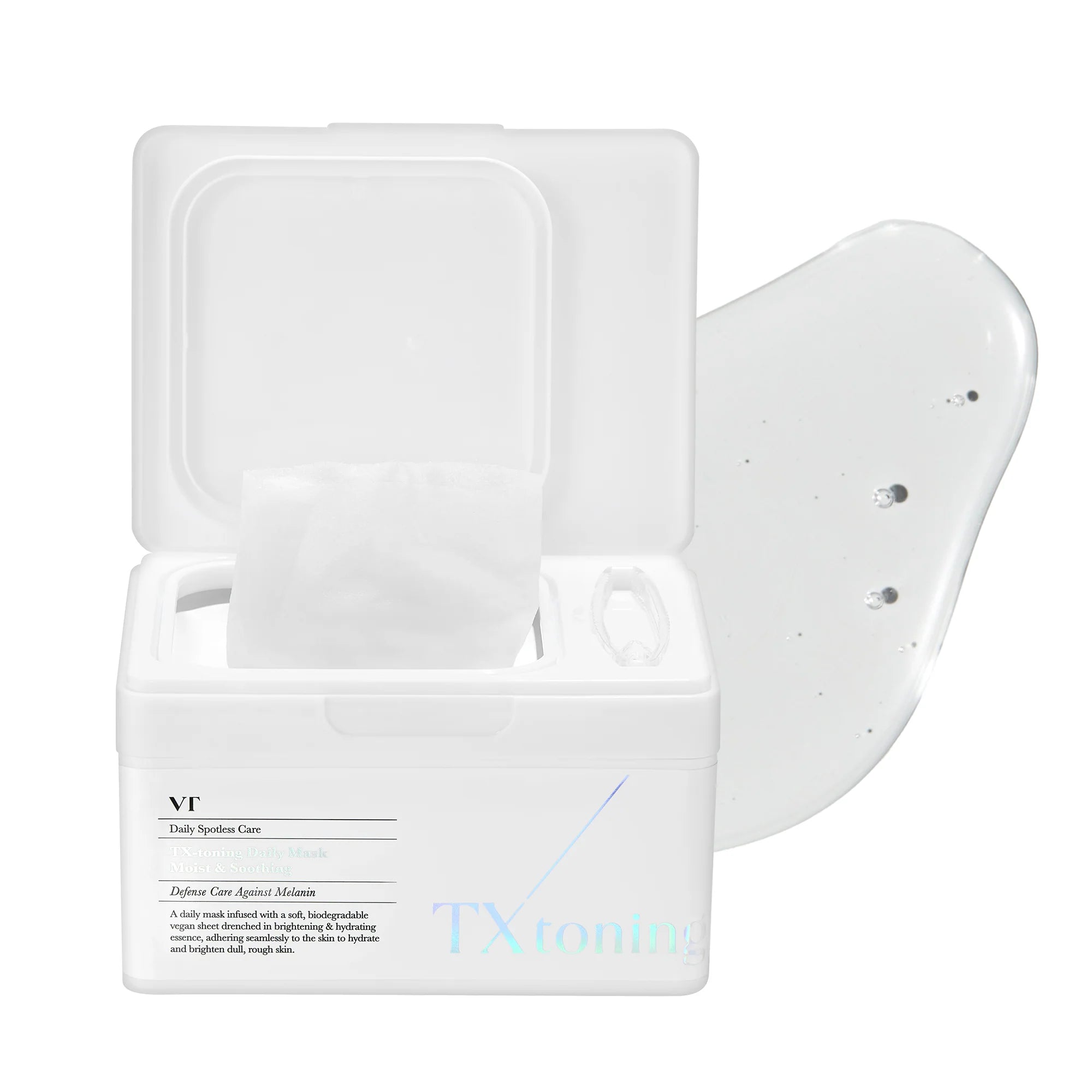 En polert daglig behandling – TX‑Toning Daily Mask kombinerer VT Cosmetics’ unikke TX Capsule-teknologi med en kraftfull Triple Toning Complex (traneksamsyre, glutation og niacinamid) for målrettet pleie mot pigmentering, mørke flekker og gustenhet, samtidig som den tilfører intens fukt gjennom 13 typer hyaluronsyre og ectoin. Masken er vegansk, duftfri og designet for sensitiv hud.