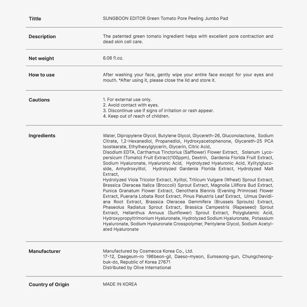 Gi huden en frisk start med Sungboon Editor Green Tomato Pore Peeling Jumbo Pad – store, fuktige peelingpads som eksfolierer skånsomt, renser porene i dybden og balanserer hudens overflate for en klar og jevn hudtone.